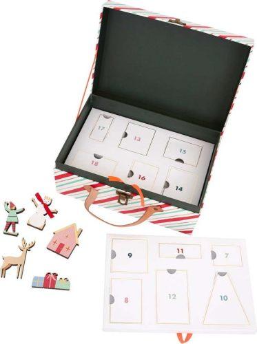 Adventní kalendář už dávno nemusí být jen plný čokolády a sladkostí. Tento kufřík z FSC certifikovaného papíru má jednotlivé číslované přihrádky naplněné dřevěnými ozdobnými figurkami.