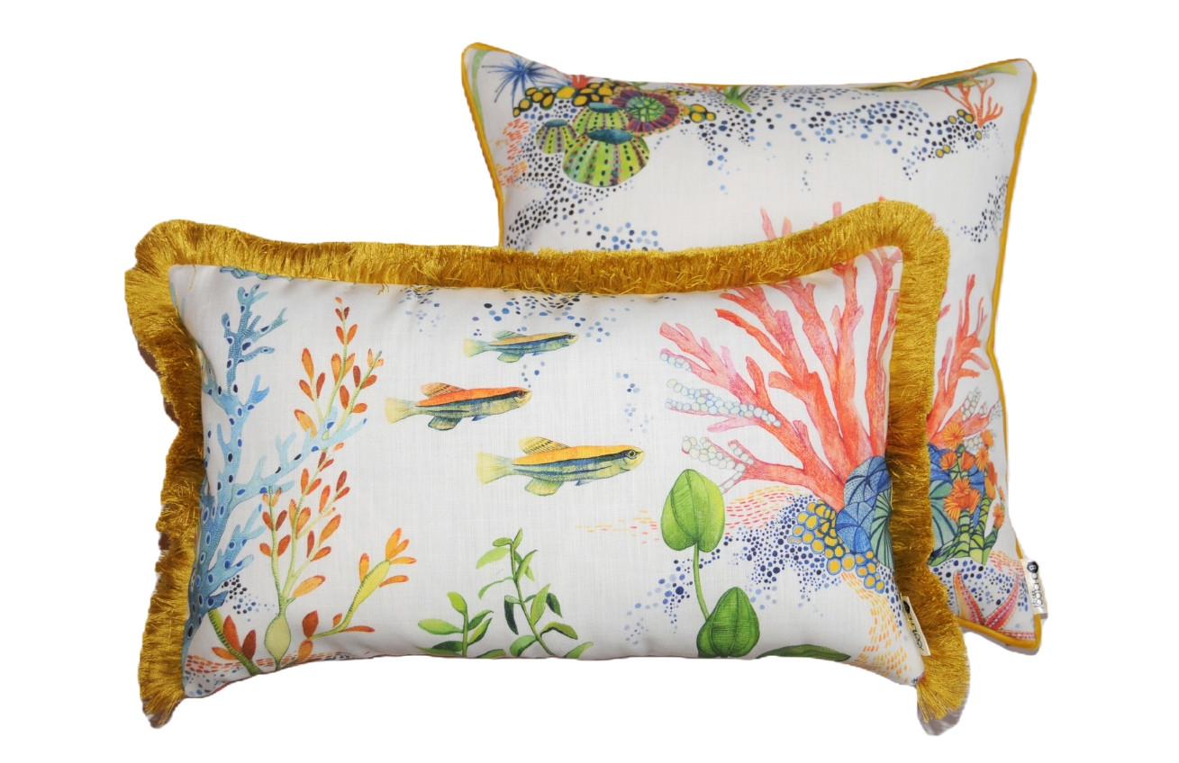 Set dvou povlaků se skládá ze série Marine od české značky BOHOLOGY, která je vyrábí z kvalitních anglických látek Osborne&Little. Ty se vyznačují výraznými barvami a nádhernými vzory, které vznikají pod rukama světových návrhářů. Povlaky mají motiv podmořského světa, přičemž první je o rozměrech 30 x 50 cm a jeho okraje lemují zlaté třásně. Druhý povlak je čtvercový s 45 x 45 cm. Druhá strana povlaků je jednobarevná, takže pokud zatoužíte po změně, můžete polštáře kdykoliv otočit a vzor tak na chvíli skrýt. Jsou vhodné do interiéru i exteriéru, kde snesou i náhlý letní déšť. Po straně mají zip, díky čemuž se dají jednoduše sundat a vyprat.